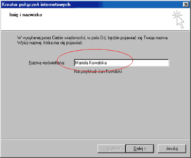 2.Otworzy się okno Konta Internetowe. Za pomocą przycisku Dodaj - Poczta należy uruchomić Kreatora Połączeń Internetowych.W pierwszym kroku należy wpisać nazwę użytkownika jaka będzie się pokazywać u odbiorcy w polu Od (np. Mariola Kowalska)