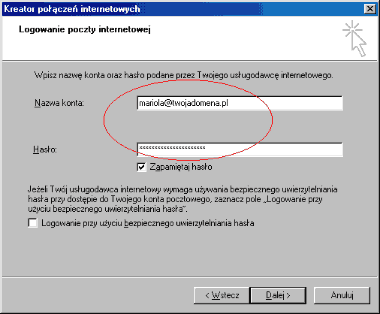 4. W następnych polach należy podać nazwę konta i hasło.